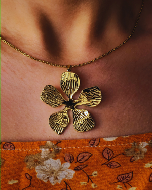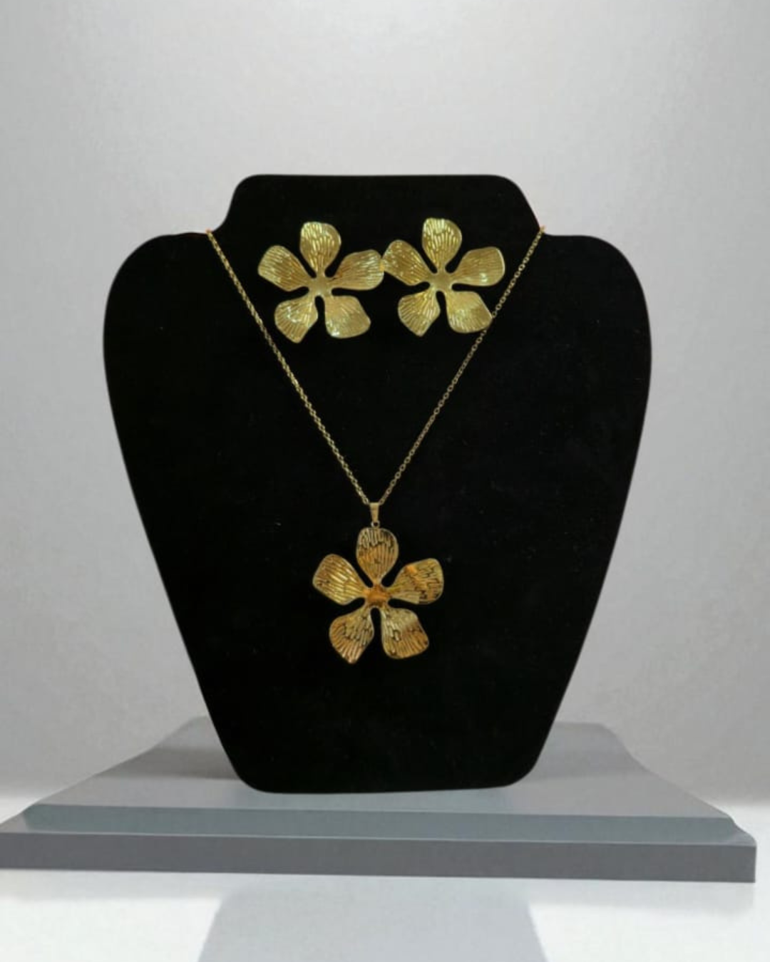 Un collier fleuri orné d’un pendentif en forme de fleur délicate 🌸, accompagné de boucles d’oreilles florales. Une touche de fraîcheur et de féminité.