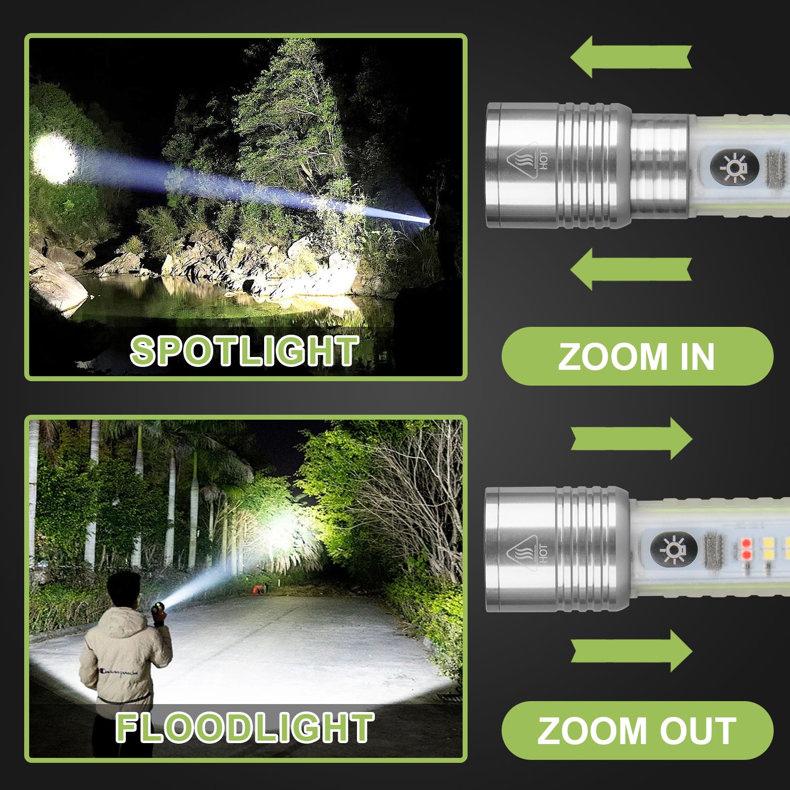📏 Portée d’éclairage : +300 mètres avec zoom télescopique